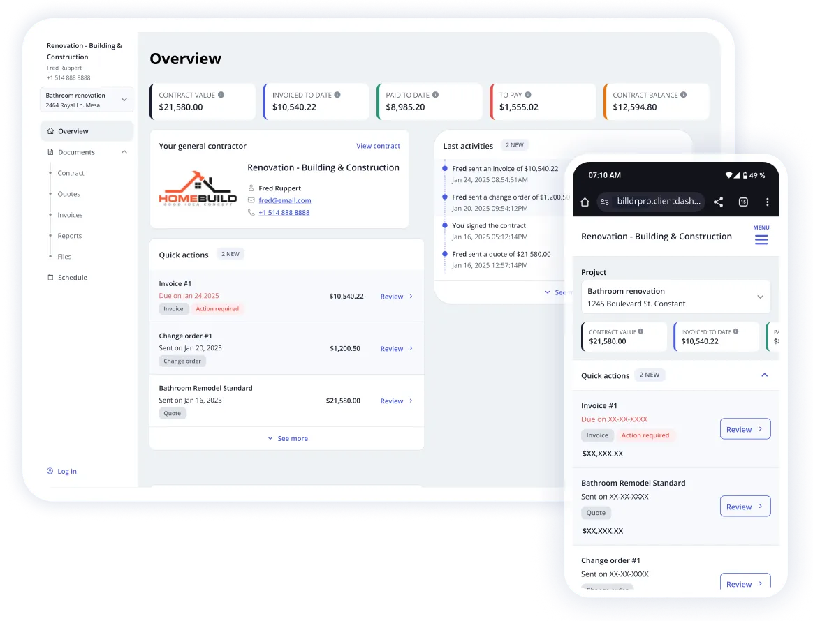 - Transparence des comptes fiduciaires : utilisez la fonctionnalité de suivi des paiements de Billdr PRO pour séparer clairement les dépôts des clients des fonds d'exploitation, créant ainsi une piste d'audit prête à être utilisée par votre avocat, la MHBA ou votre fournisseur de garantie.