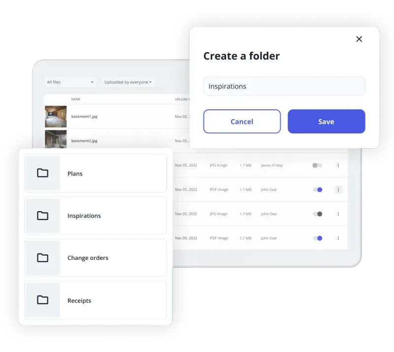 - Gestion des documents relatifs aux permis: stockez tous les plans, certificats, formulaires de conformité et documents d'inscription à la garantie dans le centre de documentation. Créez un « dossier de permis de projet » pour télécharger rapidement les documents sur les portails municipaux.