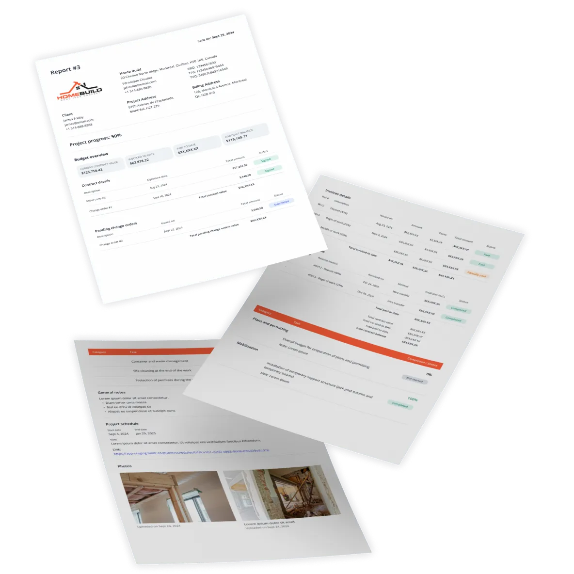 - Transparence financière : fournissez à votre souscripteur des rapports financiers clairs et professionnels , exportés directement depuis Billdr PRO. S'il constate que vous contrôlez chaque centime et gérez les ordres de modification de manière numérique, il sera moins susceptible de s'inquiéter d'une éventuelle insolvabilité de votre entreprise en cours de construction.