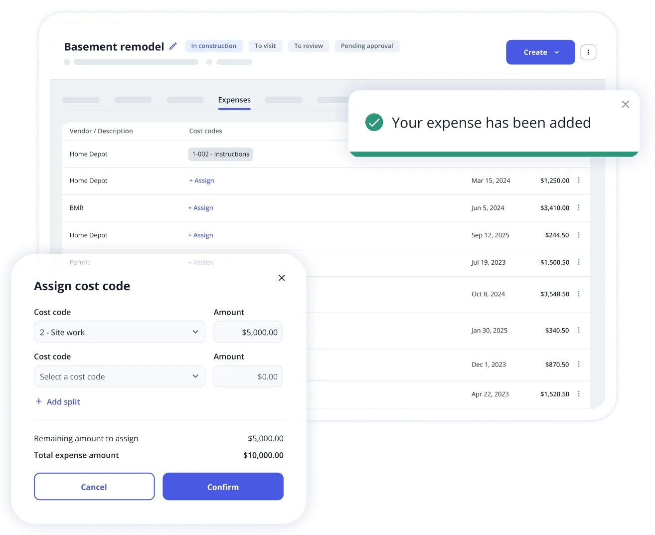 - Gestion des frais liés au projet : suivez vos frais de supervision de 95 $ et vos frais de permis municipaux dans le cadre du budget de votre projet. La fonctionnalité de suivi des dépenses de Billdr PRO garantit que ces coûts « cachés » liés à la préconstruction ne grèvent pas votre marge avant même que la première pelle ne touche le sol.